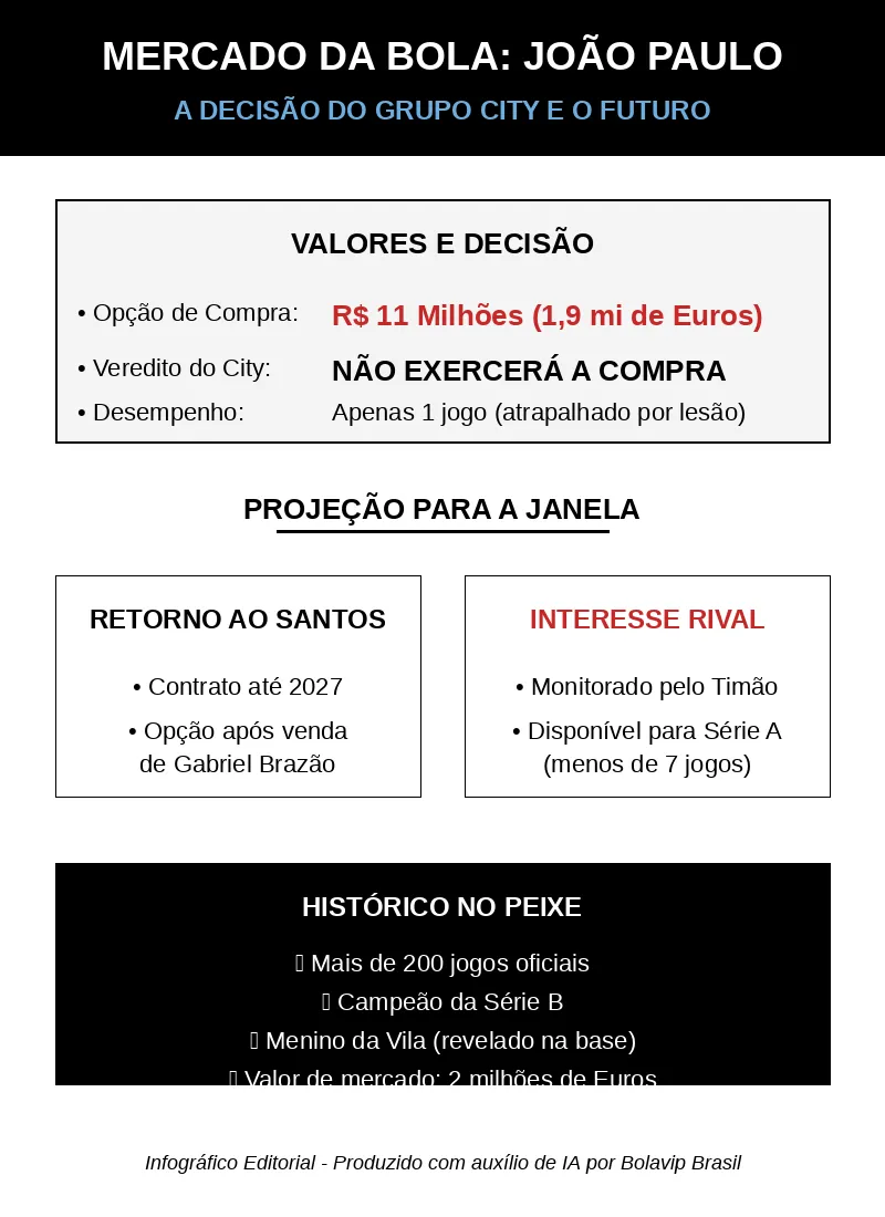 Com isso, não dá para cravar que João Paulo vai retornar ao Santos na janela de julho. Mas o retorno do Menino da Vila ao Peixe pode acontecer, tendo em vista que a diretoria estuda a venda de Gabriel Brazão.