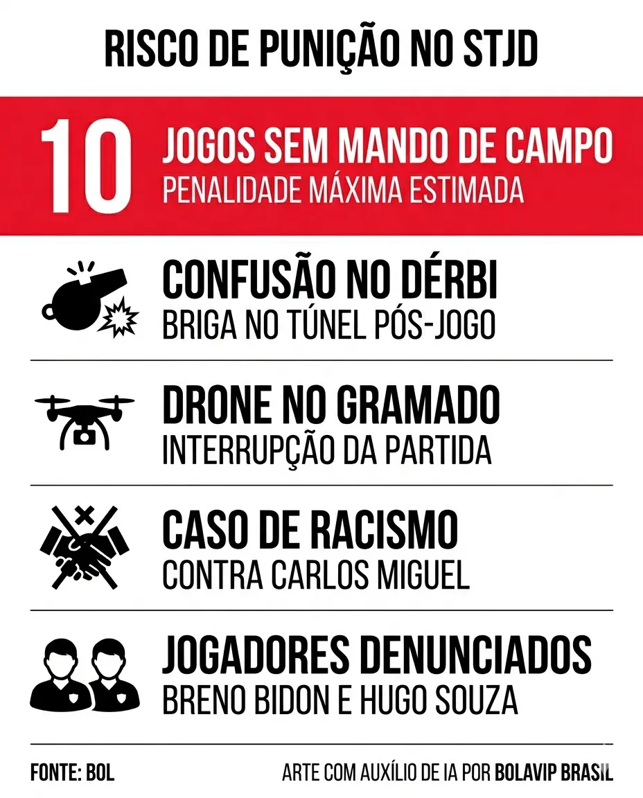 A perda de 10 jogos sem mando de campo envolveria alguns casos que aconteceram durante o Dérbi. Além da confusão na saída de campo, um drone que teria subido durante o jogo e um suposto caso de racismo contra o goleiro Carlos Miguel também serão julgados pelo STJD.