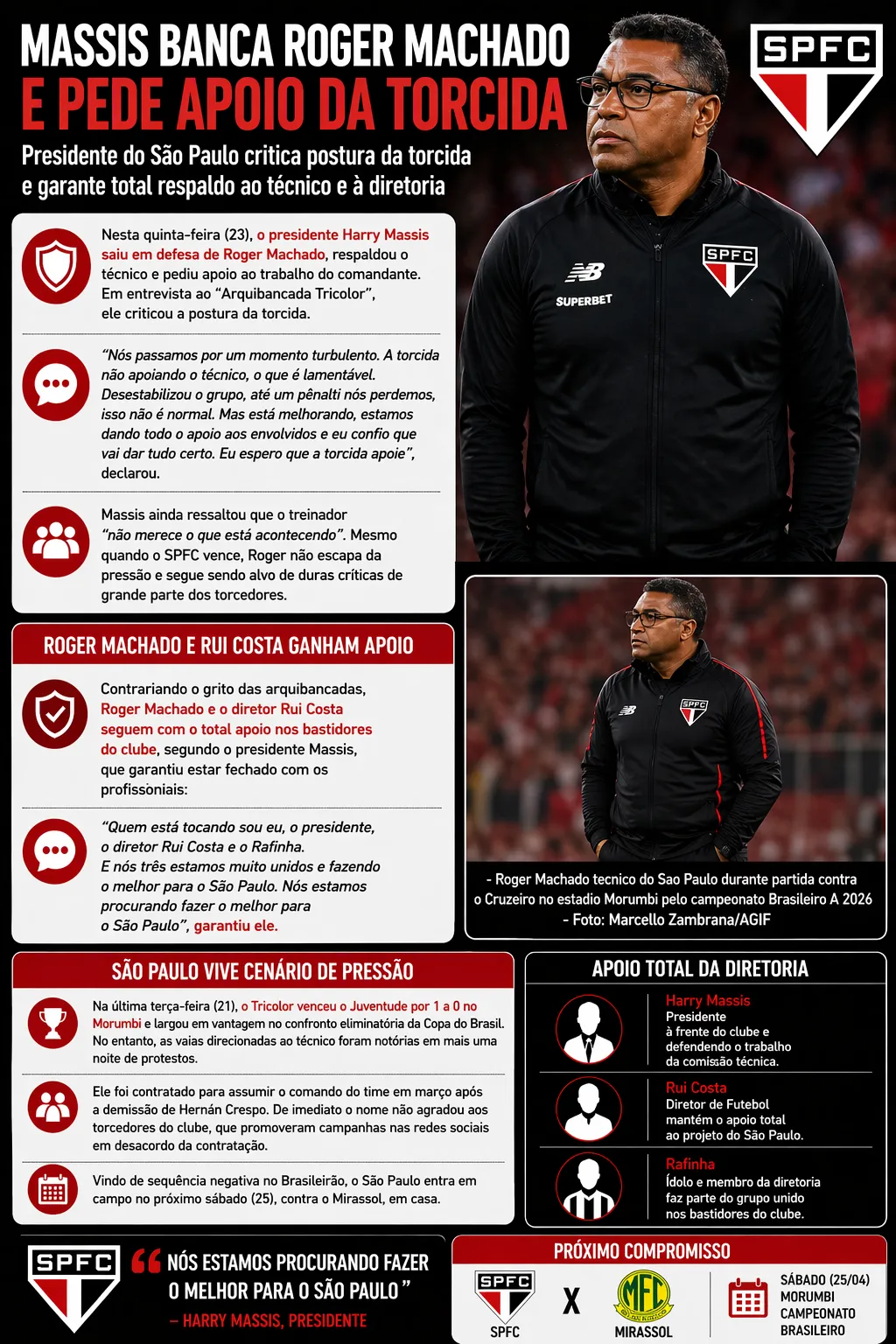 Nesta quinta-feira (23), o presidente Harry Massis saiu em defesa de Roger Machado, respaldou o técnico e pediu apoio ao trabalho do comandante. Em entrevista ao “Arquibancada Tricolor”, ele criticou a postura da torcida do São Paulo, que não está satisfeita com o momento do time.