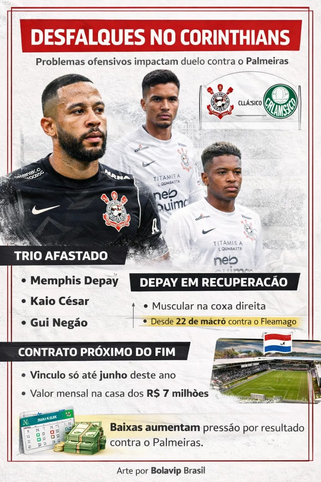O Corinthians segue com problemas no sistema ofensivo e três jogadores estão fora do jogo contra o Palmeiras: Memphis Depay, Kaio César e Gui Negão. Segundo informações de Pedro Ramiro, eles não se recuperaram a tempo e são ausências certas para o clássico.