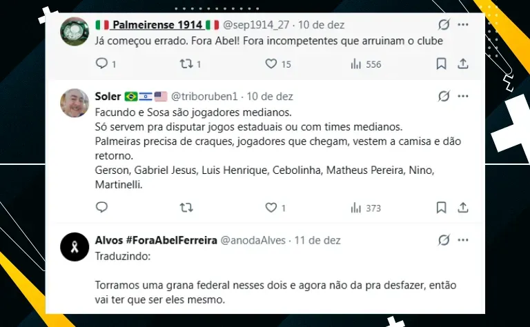 Entretanto, como defendeu a permanência de Ramón Sosa e Facundo Torres, que custaram juntos mais de R$ 150 milhões, muitos palmeirenses foram até a web criticar a fala de Abel.